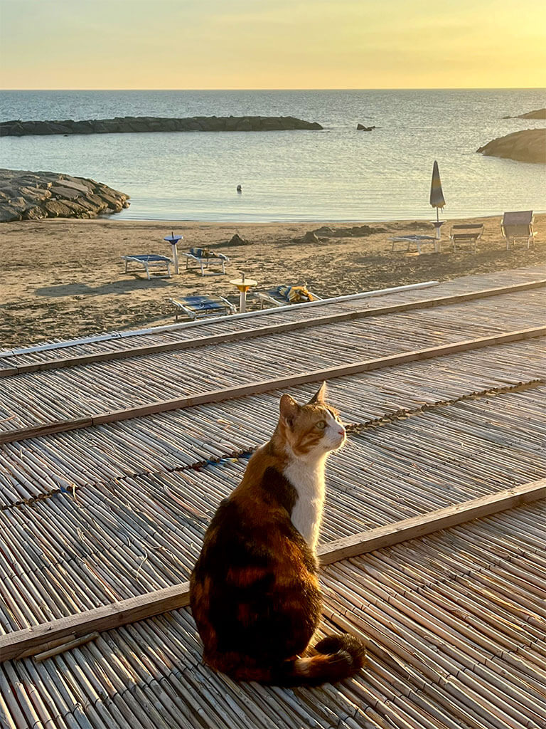 Když se slunce přiblížilo k západu, chtěla jsem si ještě trošku užít procházku po promenádě a vydala se podél moře směrem zpět. Potkala jsem starou paní s kočkou, kočka lezla po střeše plážového přístřešku, paní na ní mluvila a ona očividně poslouchala. Přiběhla se nechat pohladit a chovala se úplně jako psík. Paní ukázala přes silnici ve kterém domě bydlí a že prý takto chodí ven vždycky k večeru, když je menší provoz a kočka jí následuje. Narodila se prý na cyklostezce za domem, odkud jí paní vysvobodila a vzala si ji už jako kotě domů. A kočka je ráda, že žije tam, odkud pochází, pěkně uvnitř v pohodě a teplíčku, ale zároveň může na procházku na pláž, no komu by se to nelíbilo? 😊 Pěkně jsem paní poděkovala za popovídání, kočičku vyfotila, říkala, že jí všichni fotí a popřáli jsme si hezký zbytek dne.