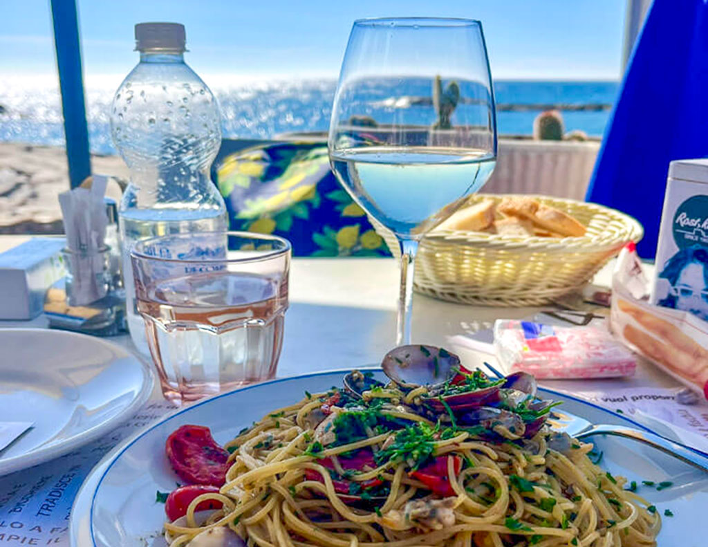 Hned za touhle uličkou se nachází promenáda lungo mare. A přesně tam jsem si šla vybrat restauraci k obědu a usadila se v té, co měla terasu nejblíž moře. Dala jsem si špagety s mořskými plody a sklenku vino da casa (domácí víno), které je lehčí než běžné víno, abych se moc nepřiopila a mohla si pak odpoledne dát ještě aspoň jeden drink na pláži 😊.